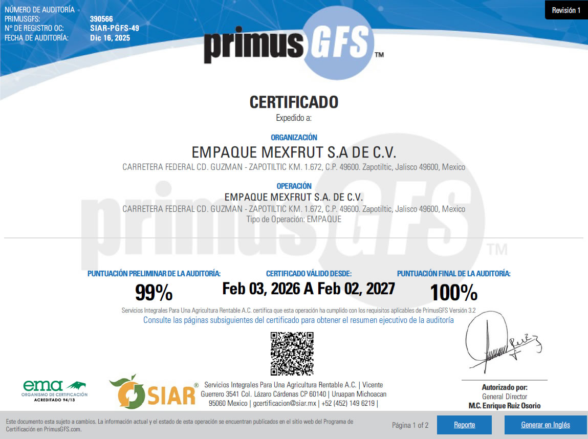 Nuestra empacadora cuenta con la certificación PrimusGFS, un estándar internacional que avala el cumplimiento estricto de los protocolos de inocuidad, higiene, trazabilidad y control de procesos dentro de nuestras operaciones de empaque. Esta certificación, obtenida con una calificación final del 100%, garantiza que nuestros procesos están alineados con las mejores prácticas globales en seguridad alimentaria, asegurando un producto confiable, seguro y apto para los mercados más exigentes a nivel nacional e internacional.