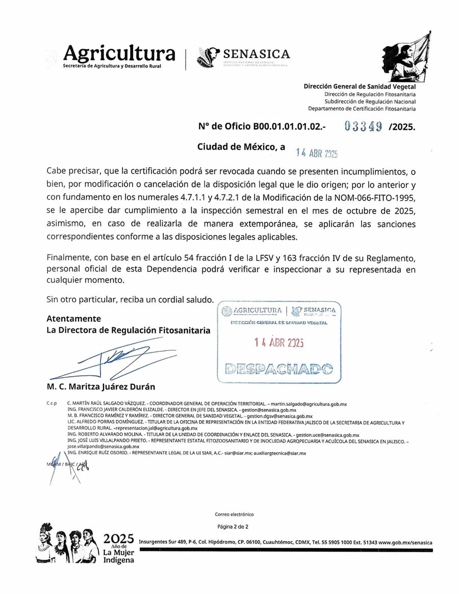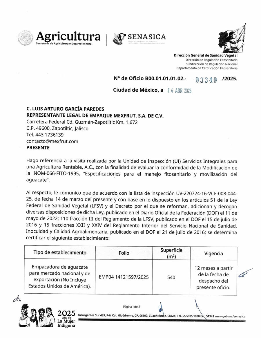 Empaque Mexfrut está certificada por SENASICA como empacadora de aguacate para el mercado nacional y de exportación, cumpliendo con la NOM-066-FITO-1995 en materia de manejo fitosanitario y control de movilización. Esta certificación respalda que nuestras instalaciones, procesos y controles sanitarios cumplen con la normativa oficial mexicana, garantizando la sanidad del fruto, la trazabilidad del producto y el cumplimiento legal para su comercialización segura.